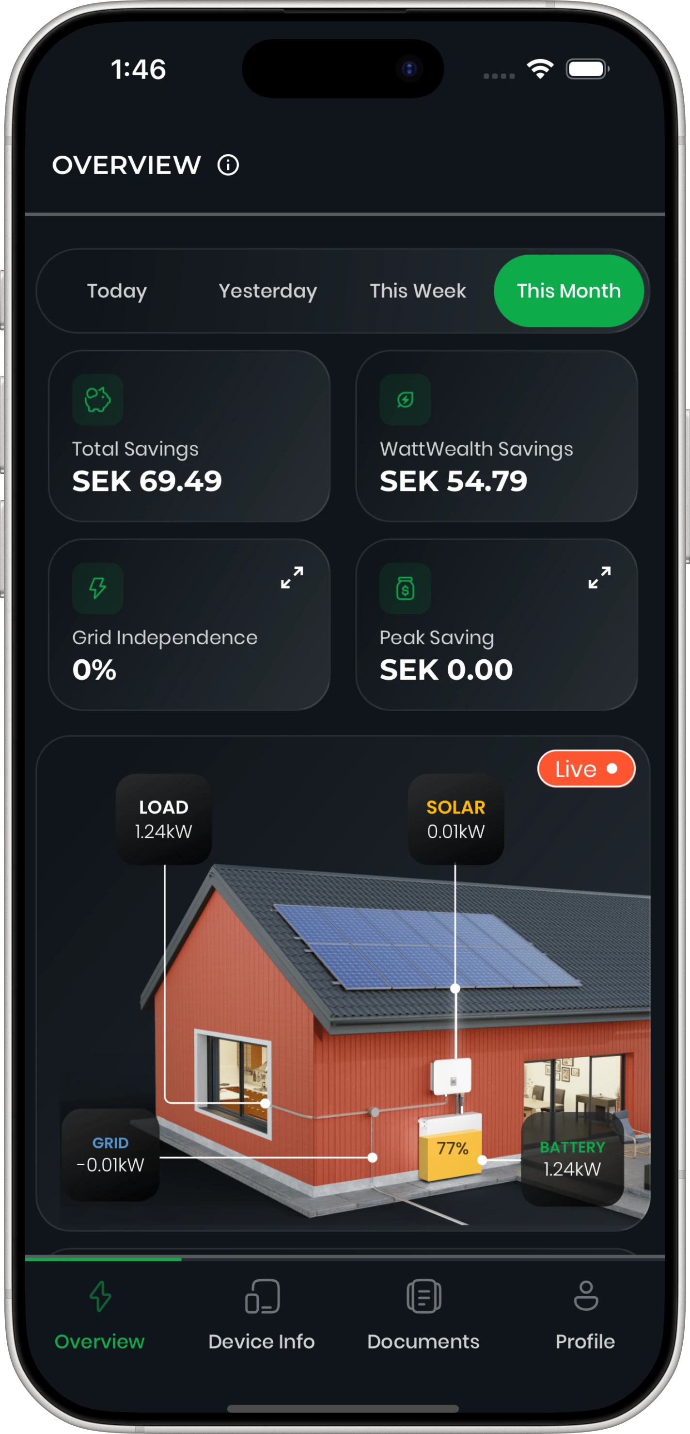 WattWealth is a smart energy management app that connects to your inverter and battery system, learns from real-time electricity prices β including effect tariffs β and automatically optimizes when to charge and discharge. The result? Lower energy bills, better battery lifespan, and smarter living β with zero hassle.
