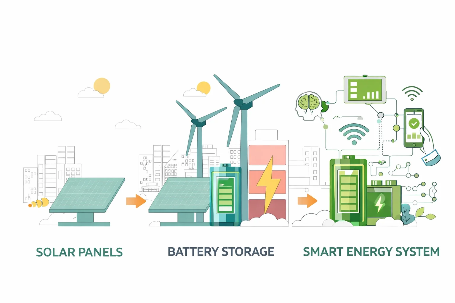 Övergången till förnybar energi skedde inte över en natt. Den utvecklades i lager — var och en löste begränsningarna hos den föregående. Det som började som enkla solinstallationer har nu blivit ett sofistikerat, sammankopplat energisystem.